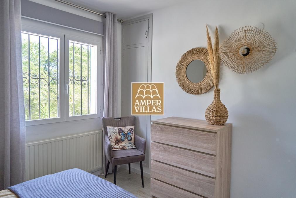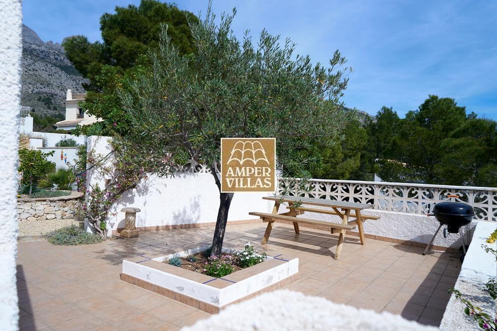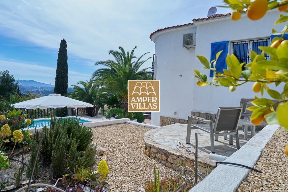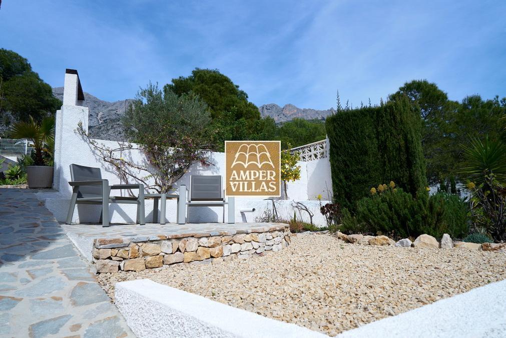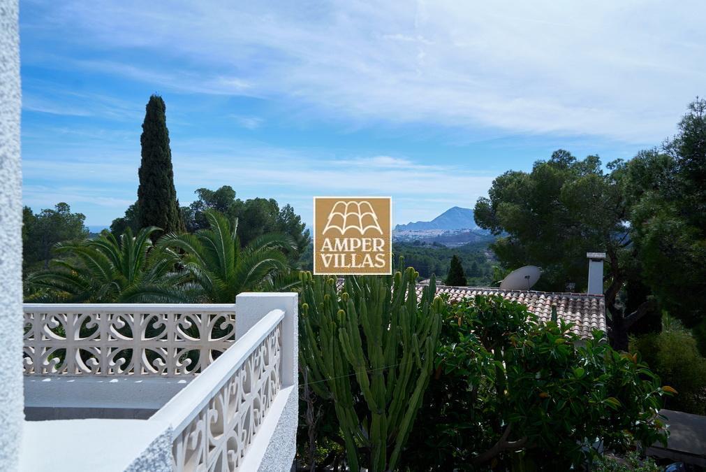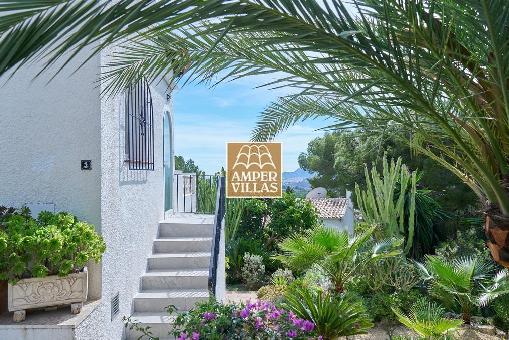Cozy villa with a lovely Mediterranean garden and beautiful views of the sea and Altea. The main floor includes a living-dining room, equipped open-plan kitchen, 2 bedrooms, a full bathroom, and a large covered and open terrace. The lower floor includes a guest room with a bathroom and a large terrace. There is a garage for 2 cars, a beautiful pool with a large terrace, a large storage room, gas heating, air conditioning, and plenty of sunlight. Located in a green area, very quiet and private.