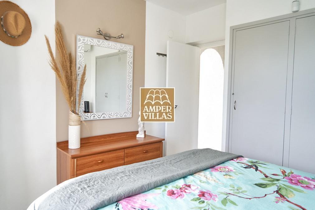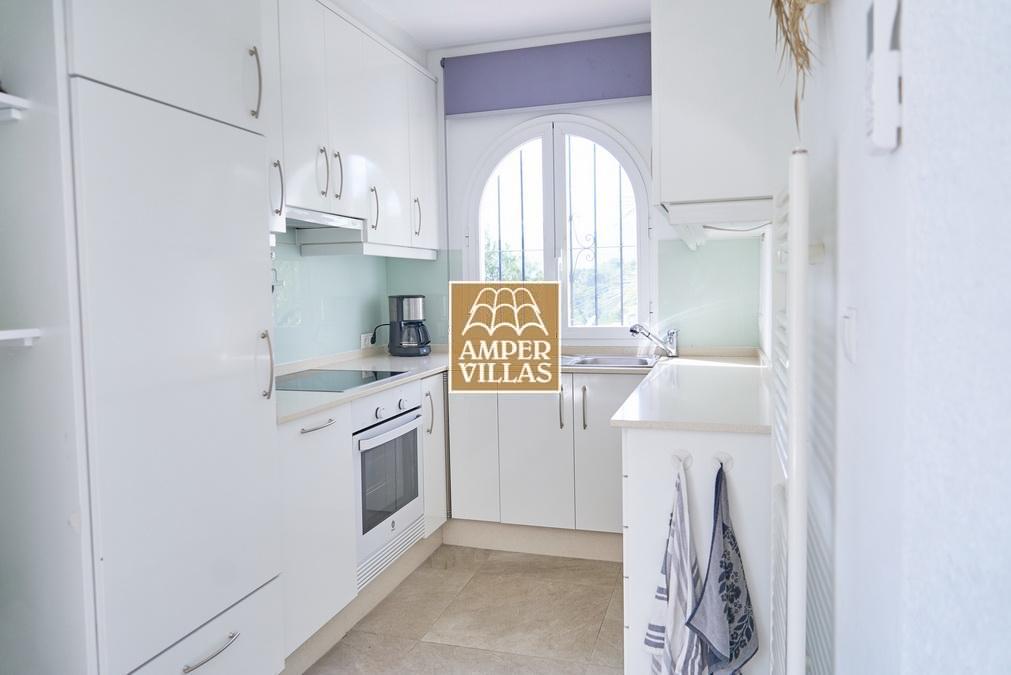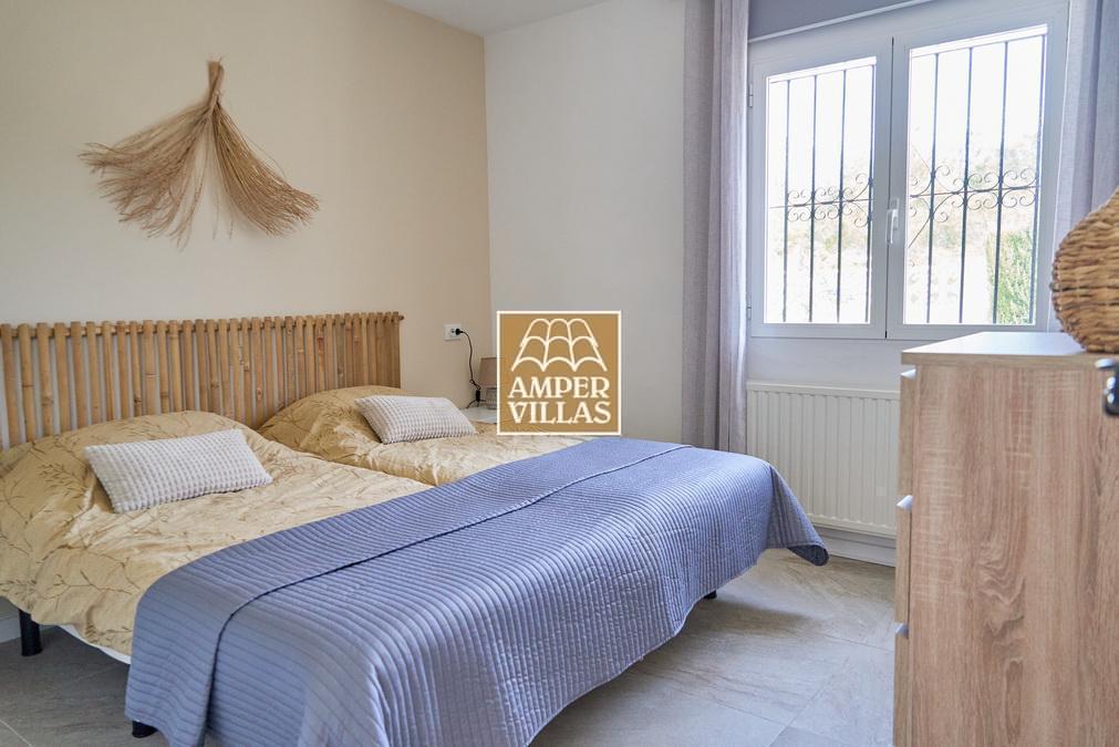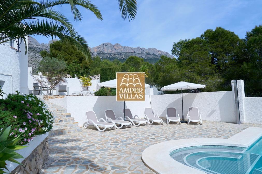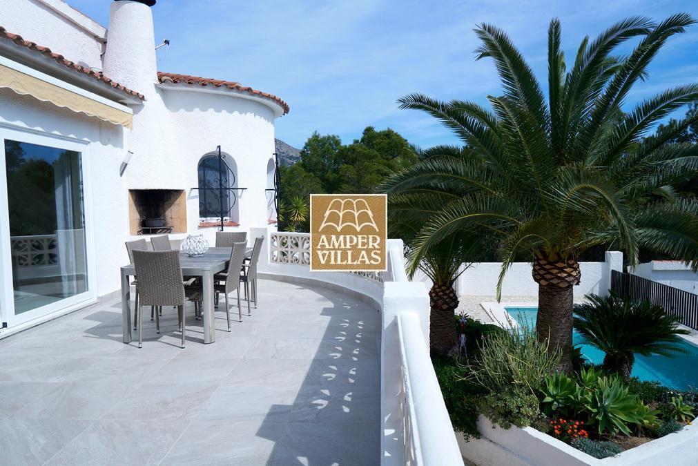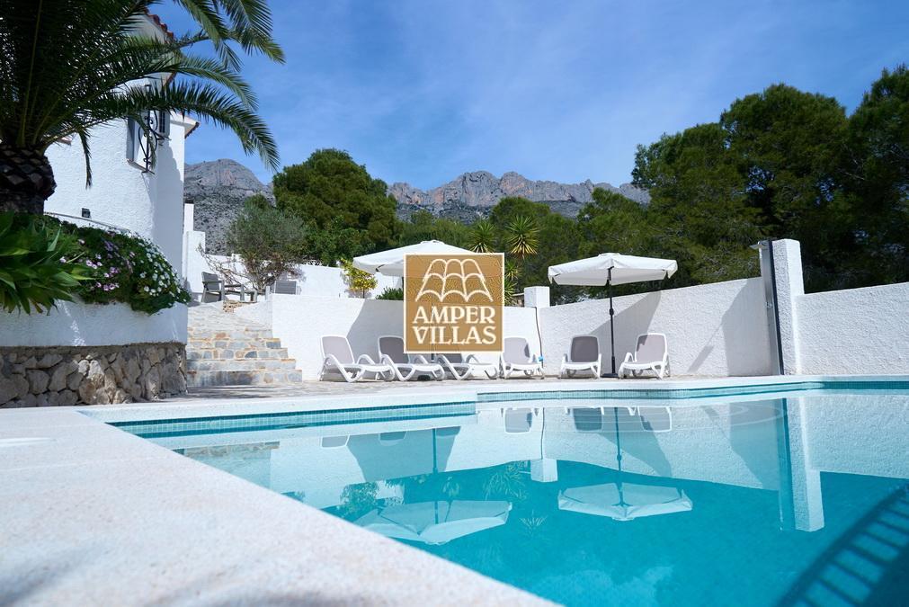 Cozy villa with a lovely Mediterranean garden and beautiful views of the sea and Altea. The main floor includes a living-dining room, equipped open-plan kitchen, 2 bedrooms, a full bathroom, and a large covered and open terrace. The lower floor includes a guest room with a bathroom and a large terrace. There is a garage for 2 cars, a beautiful pool with a large terrace, a large storage room, gas heating, air conditioning, and plenty of sunlight. Located in a green area, very quiet and private.